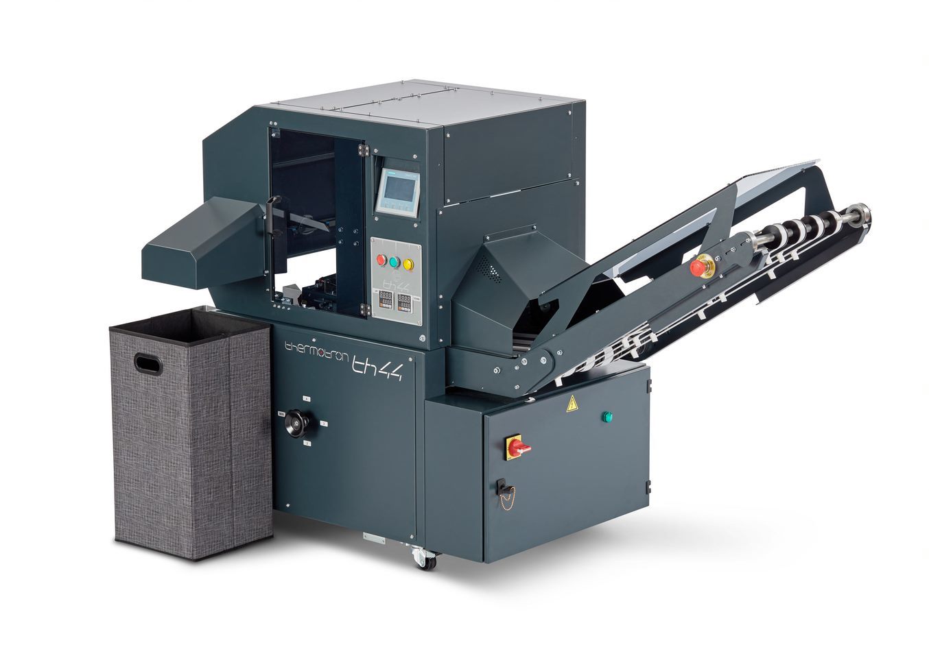 - TH44M Heat sealing of the plastic bags containing the garments and transporting the bagged product to the sorting area via a conveyor belt.